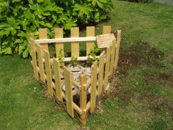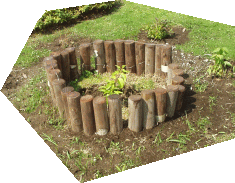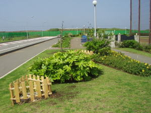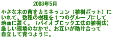 緩く傾斜した比較的広い芝生の場所。1本ずつ植えられたヤマモモが風の影響で片側が禿げている。芝生の広がりを大切にしながら、ヤマモモなど単独の木の周辺に樹木を数本群生させ、お互いに生育を助けあいながら群落として自然に成長できるようにと考えました。またバイオブロック工法と風よけ柵を利用して数本の木の群落をつくりました。 |