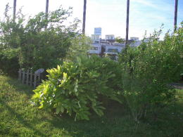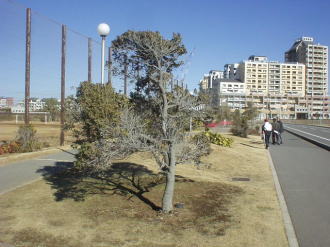 1本だけ植えられたヤマモモは風のあたる側がすっかり剥げている。 |