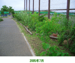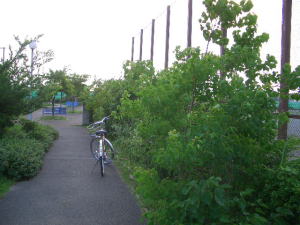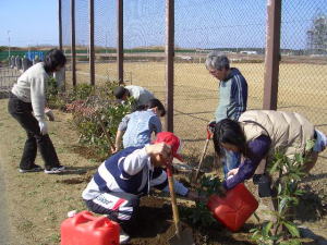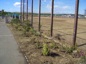 打瀬中学の防球ネットに面して、一部に低く刈り込んだトベラやシャリンバイがあるけども、枯れて土がむき出し状態のまま。せっかくの散歩路も乾燥して味気ない殺風景な景観になっている。