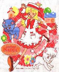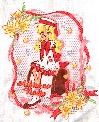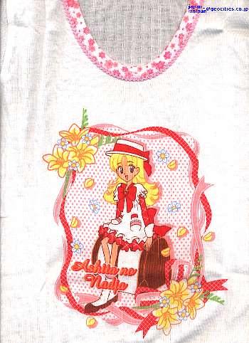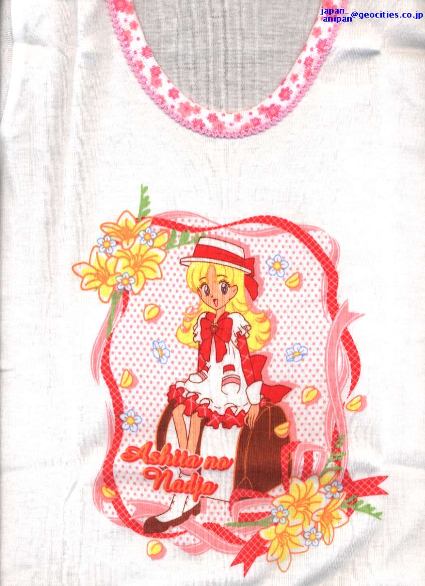 この「明日のナージャ」キャミソールの1枚目の絵柄を見て、気になった方がいるのでは?このキャミソールの絵柄は、スリーマ・キャミソールのパッケージのビニール包装、(とり直し)の一部で使われている絵柄と同一になります。つまり、デジプリされる前の段階の元絵という事になりますよね。ビニール包装の絵柄とキャミソールの絵柄の大きさは、ほぼ同一な物を作ったのでしょうか。そして本日ショーツの方もアップしていますが「明日のナージャ」7枚目のショーツの絵柄も同一の絵柄となります。絵柄の使い回しみたいな感じですが、いい意味で捕らえると【元絵】から【キャミソールのデジプリ】【ショーツの減色されたプリント】と、プリント技術の差が分かる比較ができます。恐縮だが、キャミソールをアップした画像はJPEG圧縮率が高くデジプリ本来のディテールが分かり難くすいません(私のページの殆どがJPEG犠牲率で損をしている・・・ビニール包装は特別にアップ)。リボン・リングジュエリー周り・髪の毛のプリントは、元絵と比べても違和感の無い自然な色調ですよね。それに比べるとショーツの方のプリントでは単色を使うしかなく、顔・髪の毛の色の違いで雰囲気が変ってしまうという状態です、帽子は着色指定されていないとか。。。ロゴ(個別デザインの件は別に別記している)ですが、キャミソール1枚目・ショーツ2枚目?で使われているロゴは、ビニール包装の左下にプリントされている図柄という事は・・・個別のデザインと言ってもクロスリンクされて使われる事もあるわけですね。