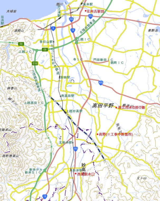 中江用水の開削高田平野東部の平地では、毎年のように水不足により多くの農民が苦しんでいた。1670年頃は特に大干ばつとなった。寛文12年(1672)今池村(上越市池)の久右衛門ほかの近隣の村々の大肝煎計12人は、費用を出し合い用水路を掘削することに決した。 工事は高野村(上越市板倉区高野)のあたりまで掘り進めたところで費用がつき、大肝煎らは、藩に対して工事継続を願い出た。 新田開発を積極的に推し進めていた家老の小栗美作は、米の収穫の増加が見込めることから、先頭に立ってこの工事を進めることとした。 小栗美作は江戸から殖産家河村瑞賢を呼び寄せた。瑞賢を伴って現地を調べ、関川上流の妙高山の麓や、関川に合流する池尻川の水源の野尻湖を視察した。瑞賢は約3か月あまり高田藩に滞在し、多くの合理的な技術的助言を行ない、西条取水口からの導水計画を推進することを考え小栗美作に助言した。そして、延宝2年(1674)から普請奉行の長尾小右衛門の指揮のもと、野尻湖池尻川に発する関川の水を分けて、高田平野の東部を縦断する大工事が延宝3年(1675)に開始された。 関川の水を水上村西条地内(現妙高市西条)で堰き止め、関川の本流を用水江に取り入れ、途中で重川を利用しながら左内古新田で保倉川に注ぐ用水路で、水路の長さ26km、川幅7.2m、両岸の土堤3.6mずつ、計14.4mという用水路で、高田平野には大熊川、小熊川、別所川、櫛池川、飯田川などの中小河川が関川に流れ込んでおり、それぞれの河川を掛樋(川や用水路を越えて水を引くための樋)によって横断する難事業であった。 藩費から2万両を支出し、遅くとも延宝6年(1678)には通水ができた。水路完成した中江用水は122カ村、石高2万5619石余(諸説ある)の水田を灌漑するようになった。完成後、用水の維持管理に藩では特別の保護を加え、小栗美作は、江回り役2人にそれぞれ二人扶持・給米4石を給し中江用水の維持管理に保護を加えた。また、年々の「御普請所」費用を頸城全部から負担させる「余荷制度」が明治6年(1873)まで採られていた。 貞享元年(1684)の「改帳」には、江口・樋口の寸法や堰の構造と共に村別用水高や立会村数が記されている。 開削当時の受益地域は122ヵ村・石高2万5千619石余、その内、別所川に掛かる福田掛樋から上流の無出金地域16ヶ村・918石余を除き、残り1万6430石余が用水組合を組織して用水路の維持管理に努めてきた。 最大の功労者である小栗美作をかたどったと言われているちょんまげ地蔵が上越市の宝寿院の境内に置かれている。 延宝6年(1678)に中江用水通水後 年が経過しました。 ![]() ※国土地理院地図利用 ❏中江用水の掛樋 小栗美作が工事を完成させた当時、川の水の引水には、川の上に樋を渡す掛樋が使用されていた。 ❏西条取水口 ❏左内古新田排水口 🔙戻る