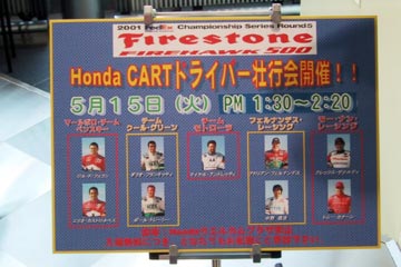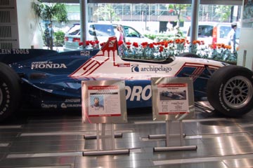 | 午後から観戦ツアーの代金を払い込みに、ホンダウエルカムプラザ青山へ向かう。 受け付けにて代金を払い込み無事完了、レースまでわずか一週間前だが、以前は前日からの行動が多いので多少進歩したかな?。 場内はCARTが展示されていて、気分を盛り上げている、とりあえず場内レポートします。 |