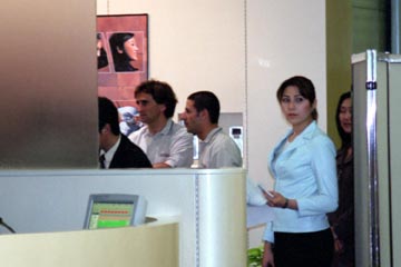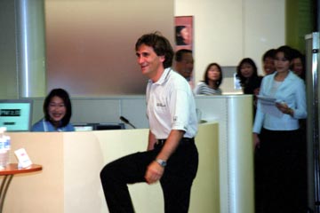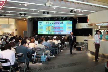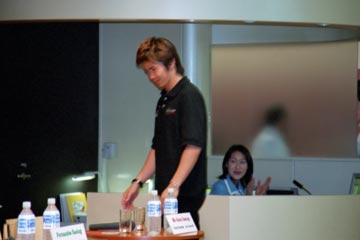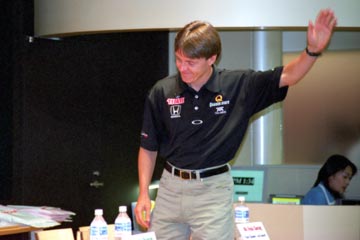 | チャンスが有ればサインを貰う様に、前日より1998年の写真をA4にプリント・アウトして準備をする。 当然、中野信治はいないのでF1当時のを用意、上手くサインが貰えれば良いのだが・・・。 午後1時30分の開催に合わせて現地に到着、すでにファンが集まっている。 席はすでに満席に近い、しかし写真を撮るには自由に動ける方が良いので、敢えて立ったまま横から見る事にする。 |