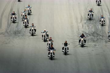 セレモニーの開始、バイクの一団が登場するが、隊列が整わない。 良く見れば、芸能人の行進だった。 岩城滉一さんチャンと先導しましょうネ。 |