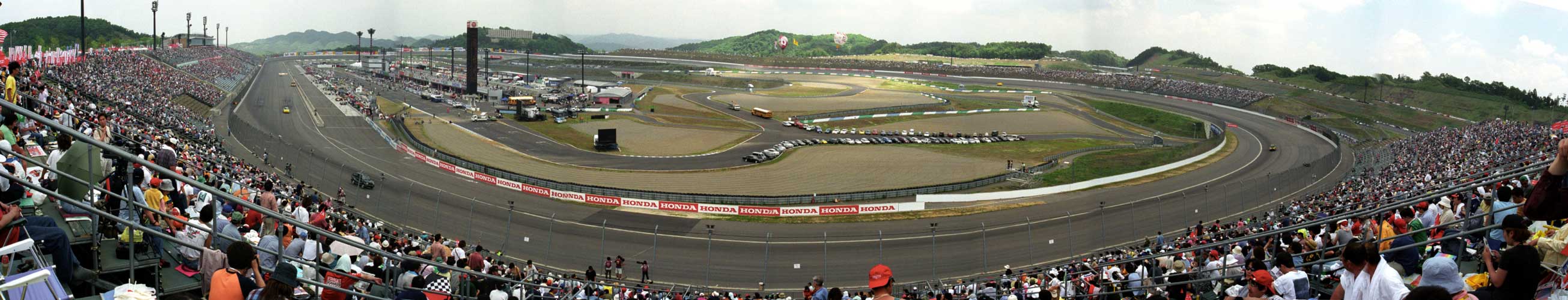 | ツアーの同行者と別れ、各自の観戦エリアに、昨日決めた場所に向かうがサーキット内は大変な混雑。 なんだかんだで、到着はレース開始間じか、さすがに空いてる席は無い。 どうせ写真を撮ろうとすると付近の観客の邪魔になるので、一番後ろの通路脇に立って観戦する事に決める。 |