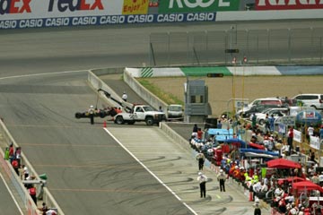 | イエロー・フラグとともに作業車両がコース内に。 | クラシュしたマシンの排除が行われる。 |