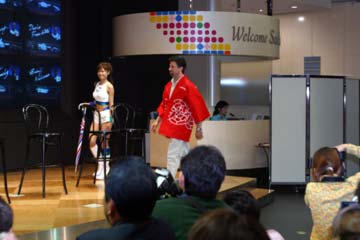 皆優勝を目指すとの発言、それなら今日ここに居る人達だけに解る秘密のサインを表彰台でする事に。 HONDAスマイルの発案で『 アイーン 』のポーズをする事になり皆で練習。←お約束のシナリオ しかし、中野信治だけは強固に断りやらない、他のドライバーから『変な事は俺達にばかりやらせる』と ジョークも飛び出す。 一応・・・一同爆笑だが・・・信ちゃんもう少しファン・サービスしてネ、でも中野の優勝は無いか・・・。 |