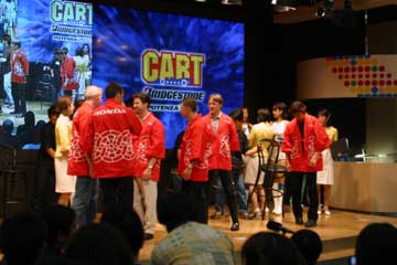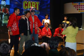 ドライバー達の抱負を聞いた後はファンとの交流の時間。 壮行会開始前に配られた抽選券により、当選者は指定したドライバーから、直接プレゼントが貰える。 先ず、サインの当選者から発表される・・・・って?!、昨年と異なりサインは当選者のみ・・・???。 ああぁ〜勘違い、やはり抽選券は整理券では無かった。 ← 当然なのに、勝手にそう信じてた・・・。 |