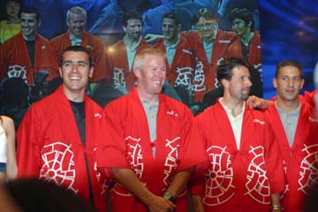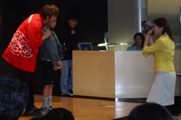 壮行会開始の時間が遅い為か(昨年は12時30分スタート)進行が早いのか?もう終了の時間。 昨年の様な全員がサインを貰える時間が無くて残念、集まったファン達もサインを貰う為に色々グッズを 用意していた様子だったのに・・・。 |