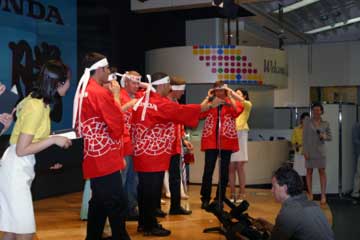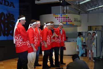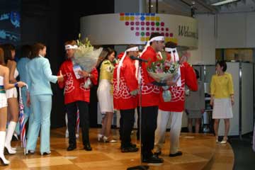 最後はドライバー達全員 『 必勝ハチマキ 』 で三本締め、地元での優勝を誓い壮行会の幕を閉じる。 |