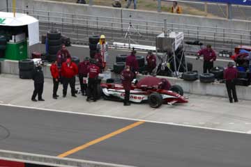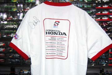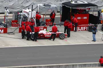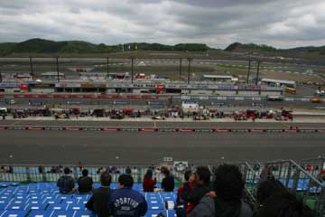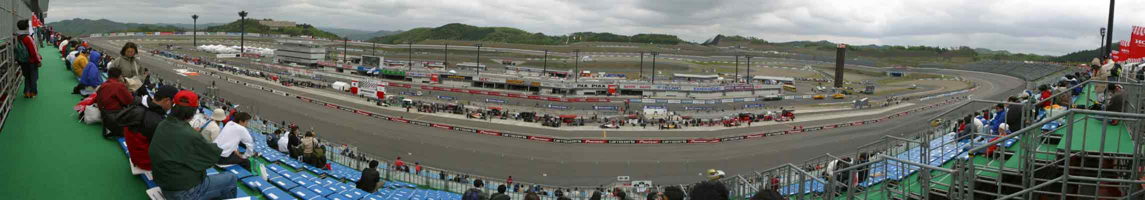 今年も昨年と同様に、車内のビンゴ大会でエイドリアン・フェルナンデスのTシャツをゲット。 しかし、自宅で良く見るとHONDAドライバーの名前がが9人!、昨年の売れ残りにサインした物なの?嬉しいけど・・・・ちょっとケチくさいぞ!!!。 サーキットまでの途中では雨が降る時も有ったが、しかしサーキットに着くと何とか回復する様子。 しかし小雨でも走行しないオーバル・コース、スタンドに着いた時はフリー走行が中断していた。 先ずは恒例のパノラマ写真からどうぞ。 |
