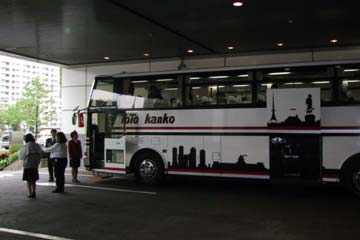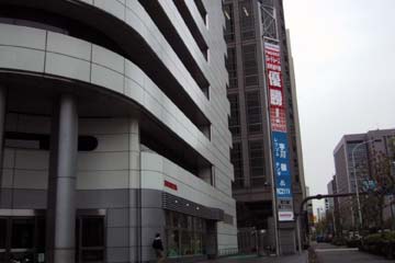 | 到着したHONDA本社、正面にはロードレース優勝の宇川徹の垂幕。 此処にCARTの垂幕が出るか?。 | |