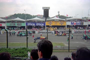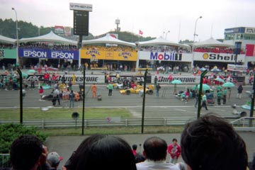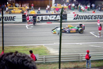 | 遅れてて登場、ブラバムのマーティン・ブランドル。 15分の間にコースインしないと、ピットスタートになる。 | 何故か白煙を吐くミナルディ、パオロ・バリッラ、消火器の誤動作らしい。 確かスパゲッティ・メーカーの御曹司。 |