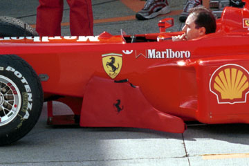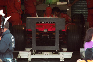 | 朝8時頃目覚める、早速車外に出てバンパーを確認、やっぱりへこんでる!、やっぱり夢じゃ無かった!。 ゆっくり歓談しながら10時頃まで朝食を摂る。 話題はやはりチャンピョン争い、前戦のマレーシアGPでの見事なミハエル・シューマッハーの復活、その後の失格騒動・・・お約束の様なフェラーリ寄りの裁定、話は尽きない。 食事が済み車の目隠しをした後、グランド・スタンドまで出かける事にする。 木曜日は未だレースは始まらないが、グランド・スタンドでピット作業が観戦出来る。 これが楽しみで、水曜日にサーキット入りしたのだ。 グランド・スタンドに着くと早速ピットを見学。 当然最初はフェラーリの前に陣取る。 |