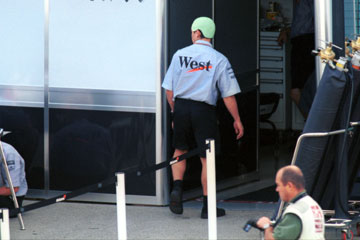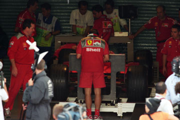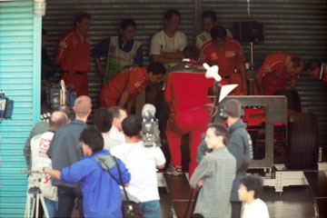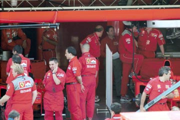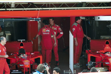 | 慌ただしく作業する、フェラーリのピット。 奥にジャン・トッドが見える。 | ミハエル・シューマッハーも姿を現す。 |