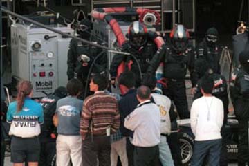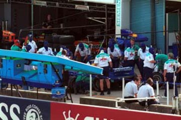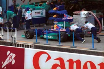 | ピット作業を行う、ザウバーの様子。 | ←こんな感じで、メカニックが押して。 |