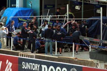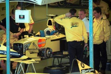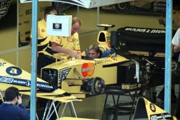 | レーシング・スーツに着替える、デーモン・ヒル。 | 壁のスズメバチがお茶目なジョーダンのピット、上位陣に一刺し出来るか?。 |