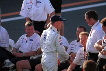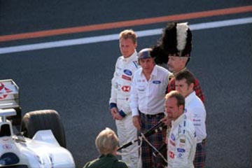 | 来期はフェラーリ・ドライバーとなるバリチェロは、神妙な表情。 | ジャッキー・スチュワートから、寄せ書きされた記念品のプレゼント。 |
