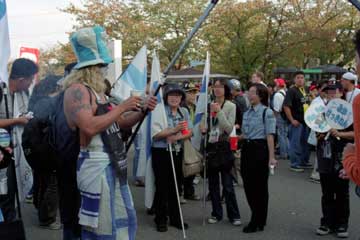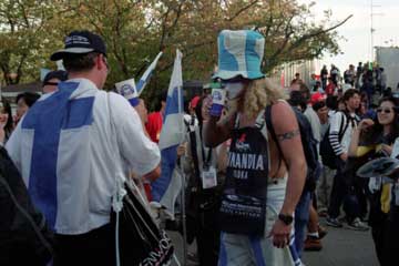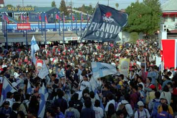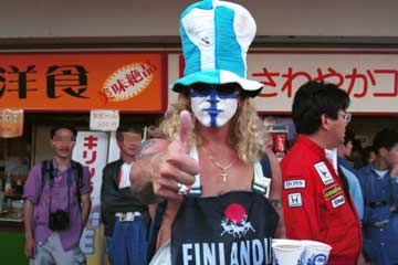 もう今日は面白い出来事は無し・・・と思ったら、グランド・スタンド裏(スタンドの入り口)付近が何やら騒がしい。 どうやらミカ・ハッキネンの応援団が集合して気勢を上げている様だ。 |
