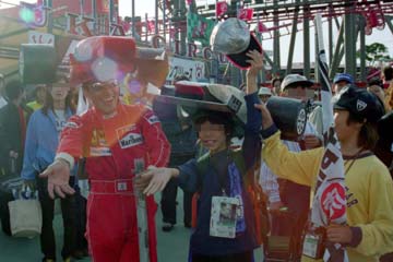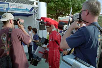 | 外人にも注目されてご満悦。 | 通りすがりの子供に、マクラーレンの帽子を被せて、ポーズをとる。 |