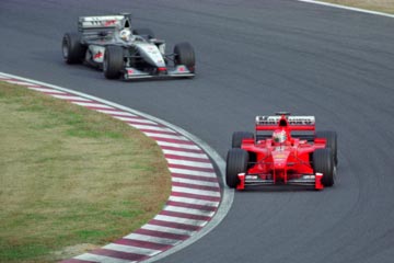 デビッド・クルサードに頭を抑えられたエディ・アーバイン、早めに2度目のピットインを決行。 その直後デビッド・クルサードがスプーン・コーナーでスピン!。 緊急ピットインしたデビッド・クルサードは下位に沈む・・・が、2度目のピットインを終えたミハエル・シューマッハーは周回遅れのデビッド・クルサードの後ろに付く事になる。 デビッド・クルサードの絶妙な援護?でレースの行方はミカ・ハッキネンのものに。 終盤の43週目、高木虎之介がメイン・ストレートでスローダウン、さらにその後方を走行していたルカ・バドエルのマシンが豪快にエンジン・ブロー共にリタイアとなる。 |