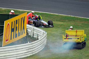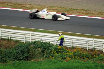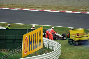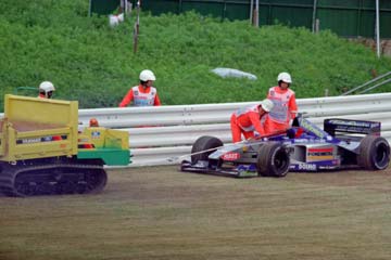 | マルク・ジェネ、1コーナー先でストップ。 | すかさずマシンの撤去が始まる。 |