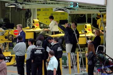 ジョーダンのピットには引退を表明したデイモン・ヒルが現れる。 直ぐ前のスタンドに陣取ったファンからの声援に応えて、デイモン・ヒルが最後の挨拶を行なう。 |