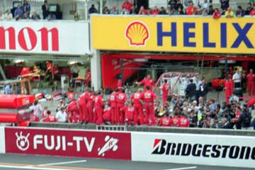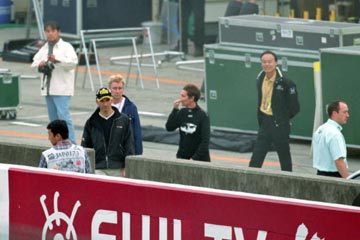 | レース終了後の帰宅ラッシュの中、グランド・スタンドに移動しピットの様子を見学する。 マクラーレンのピット前を目指して移動中、フェラーリのスタッフがコンストラクターズ・チャンピョン獲得を祝っているのに気付く、急遽撮影開始。 |