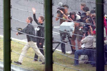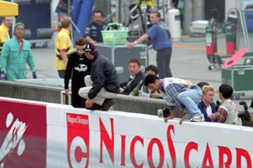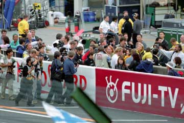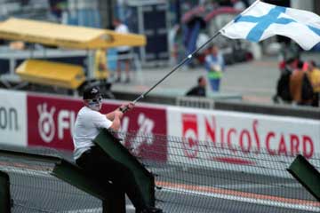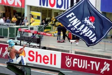 | 昨日のフィンランド人応援団がフェンスに登ってミカ・ハッキネンの登場を待つ。 | |