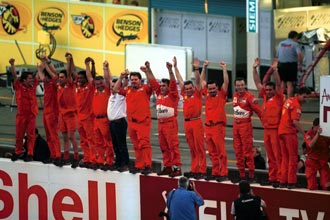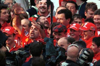 | 優勝インタビューを受ける、ミハエル・シューマッハー。 | その間、スタンドの声援に応えるチームスタッフ。 |