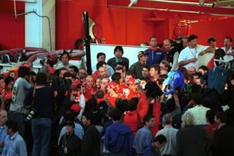 | 待つ事30分ほど、17時過ぎに表に現れる。 予想通り人垣の合間から、ミハエル・シューマッハー、ルーベンス・バリチェロを撮る事が出来た。 | 報道陣に囲まれて、歓喜の記念撮影。 |