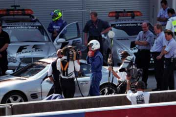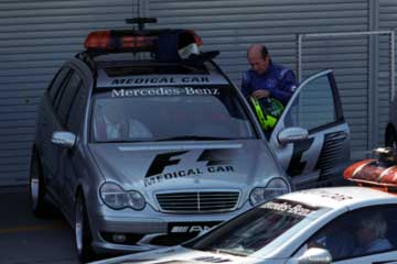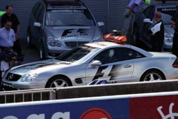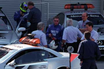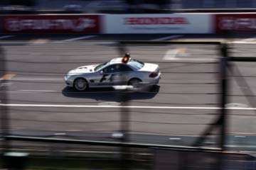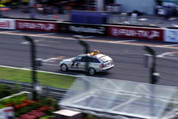 表彰式の練習の行われている下ではMEDICAL・CARとSAFETY・CARのテスト走行の準備が始まる。 ドライバーは・・・ペラ・ペラ・・・(オフィシャル・プログラムを調べる音です。) (^^:: ドライバーはMEDICAL・CAR>アレックス・リベイロ!。SAFETY・CAR>バーナード・メイランダーです。 |