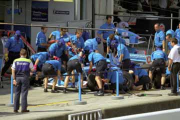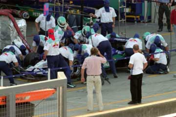 ジョーダンは左フロントタイヤの取り付けが新人?らしく失敗、一人だけ特訓を受けていた、本番では大丈夫?。 フェラーリも練習していたが良く見えなく、スタンドを移動したがその時にはすでに終了していた、残念。 BARとジャガーは確認出来ず、私が昼食で席を離れた時にでも行ったかは不明。 |