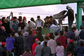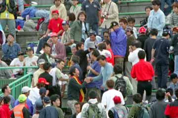 | 観客の大声援を受けながらE2スタンドの放送席に向かう。 | |