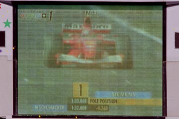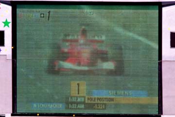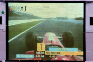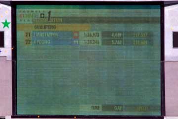 各車気迫の走行が続き、ゲルハルト・ベルガーの持つ1分34秒700はあっと言う間に破られる。 中でもミハエル・シューマッハ−は別格、なんと2秒以上も縮め1分32秒484でP.Pを獲得、速さを見せ付ける。 予想を1秒以上上回るスーパー・ラップにびっくり、でも私の予想タイムは数字の並びは似ている。(と勝手に思う) 2番手はファン・パブロ・モントーヤやはり只者ではない、以下ラルフ・シューマッハー、ルーベンス・バリチェロ、ミカ・ハッキネンと続く。 期待のHONDA勢はヤルノ・トゥルーリが8位でトップ、ジャン・アレジは11位、ジャック・ビルヌーブ14位、オリビエ・パニス17位と下位に沈む・・・残念、悲しい。 |