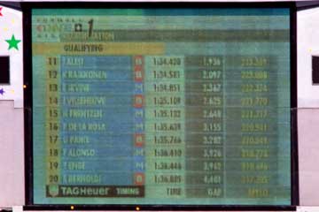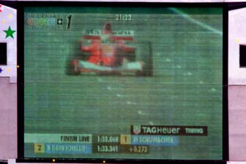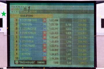 | ミハエル、1分33秒068でいきなりトップに踊り出る。 | ルーベンス・バリチェロも2位に付けるが・・・。 |