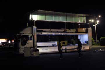 | ついでにガソリン・スタンドも。(^^; | 横ではBMWが展示物の搬入作業中でした。 |