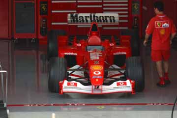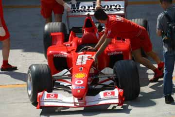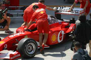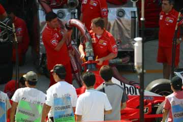 当初S1エリアで見学していたが、フェラーリのピットで動きが在る様子。 早速フェラーリのピットが有る1コーナー寄りのS2スタンドに移動開始。 しかし、フェラーリの正面のスタンドとは繋がっていない、急いで移動したが到着時にはタイヤ交換の練習は既に終了間際、残念。 |