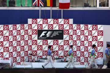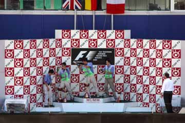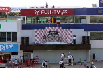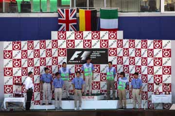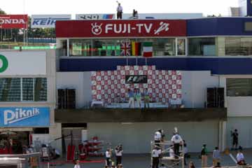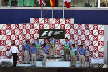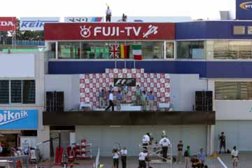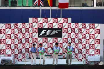| 代役のオフィシャル達が表彰台に上がる。 後ろのセットは未だ昨年のままだ。 | |