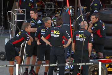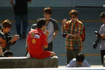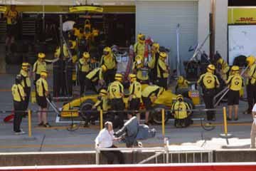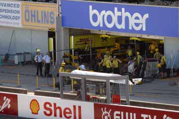 ミナルディのピットに動きが、どうやらピットインの練習を始めるらしい。 場所を少し移動して見やすい席を確保するが中々始まらない・・・。 その内に、今度はジョーダンも練習を始める様子、さらに移動してこちらを見学する。 |