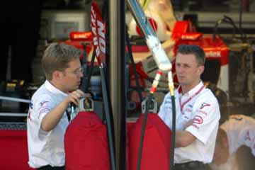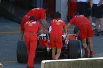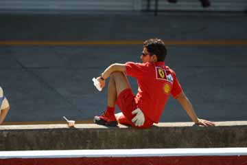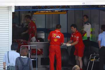 ピットの一番左側は車検場になっている、木曜日には各チーム組み上がったマシンを各自でチェック。 そんな中、順番を待つフェラーリのメカニックに注目!。 |