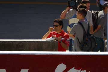 | 観客が止めたフェラーリのマシンに注目するのに、無視して何かしている。 良く観ればアイスクリームを食べてます。(^^) | |