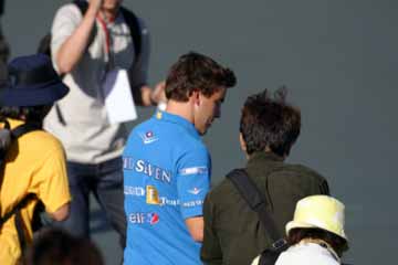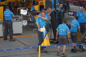 グランド・スタンドを通り抜けるドライバー、周辺のファンが騒ぎ出すが・・・誰だっけ?。 見覚えが在るが・・・、現ルノーの2人じゃない・・・、見覚えのある顔だが・・・。 そうだ!テスト・ドライバーのフェルナンド・アロンソだ!、誰だか気づいた時には既に遠くに・・・。 |