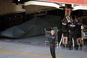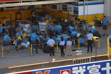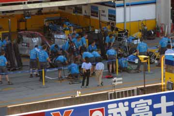ピット・インの練習も、通常のタイヤ交換や燃料補給のみならず、トラブル時の対応を含めて行う。 より実戦的練習だが、耐火服などの服装や装備を用意して行わないのは、ちょっと減点だな。 |