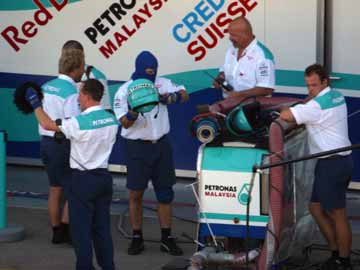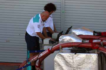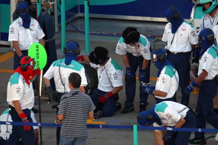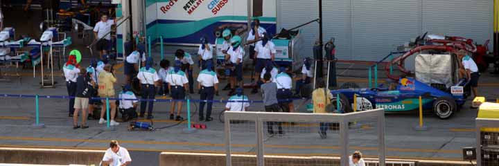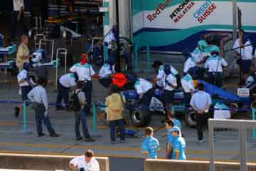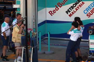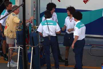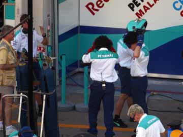 今度はザウバーのピットイン練習が始まる。 しかし、右前輪担当のメカニックが変・・・、何とカツラを付けての練習だ。 この2人はピット奥から現れた時には、スキップをしながら登場していた。(写真撮れませんでした。) |
