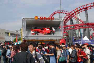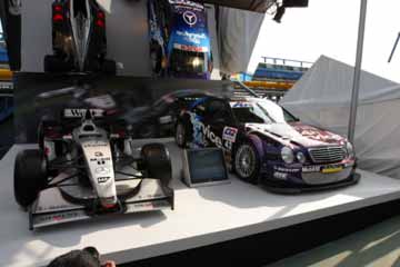 | メルセデスのブースにはF1とDTMのマシンを展示。 | フェラーリの前の人だかりはボーダーフォンのもの。 |