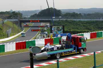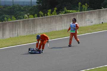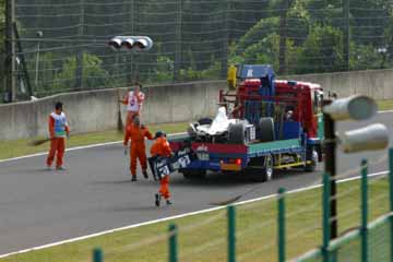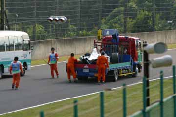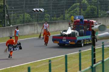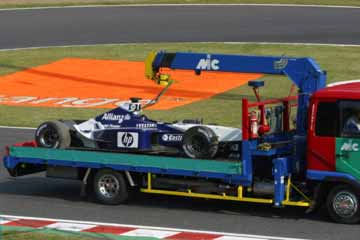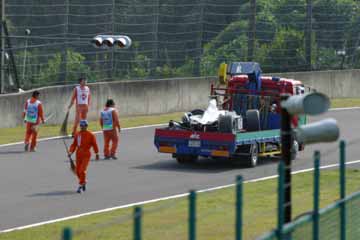 F1のフリー走行が終了、遅い昼を摂りながら一休みしていると、デグナー・コーナーでコース・オフした モントーヤのマシンが運ばれて来る。 何気なく観ていたが思わぬ出来事が発生!。 |