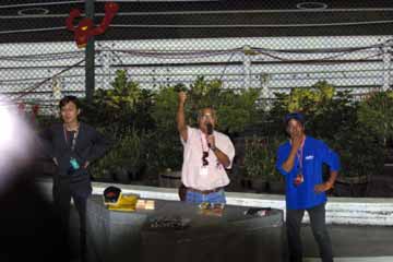 思わぬ出来事を楽しんでいる内にそろそろ集合の時間、再び集合場所に戻る。 暫くして受け付け開始、閉園時間を過ぎ人の居なくなったグランド・スタンドに再入場。 けんさわさんの挨拶で、お祭りの開幕。 |