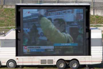 予選の興奮の余韻を楽しみつつ、サーキット・ビジョンに映し出される佐藤琢磨に声援を送る。 |