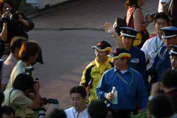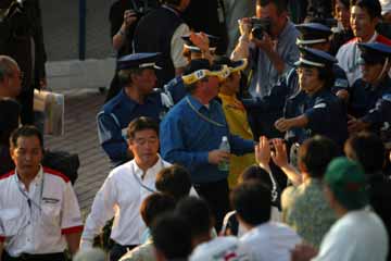 途中まで各チームの様子を観ていると、場内アナウンスが響き渡る。 『 明日の大事な人です!、怪我の無い様に注意して下さい!。 』 見るとイベントの終わった佐藤琢磨が、グランド・スタンドを通ってピットに戻る所だった。 |